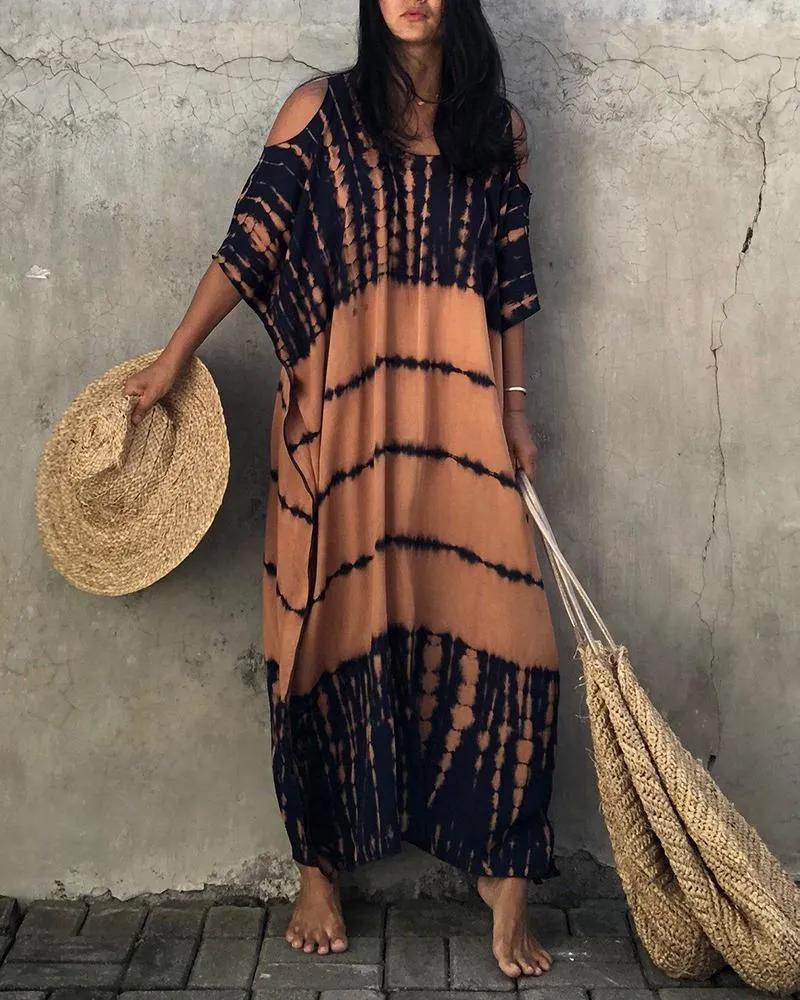 Tie-Dye Print Cold-Shoulder Casual Maxi Dress
